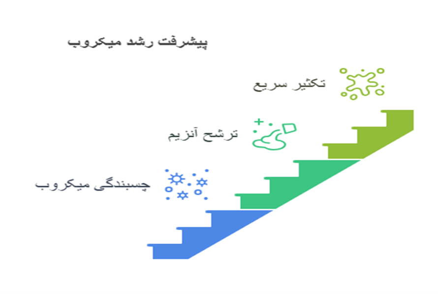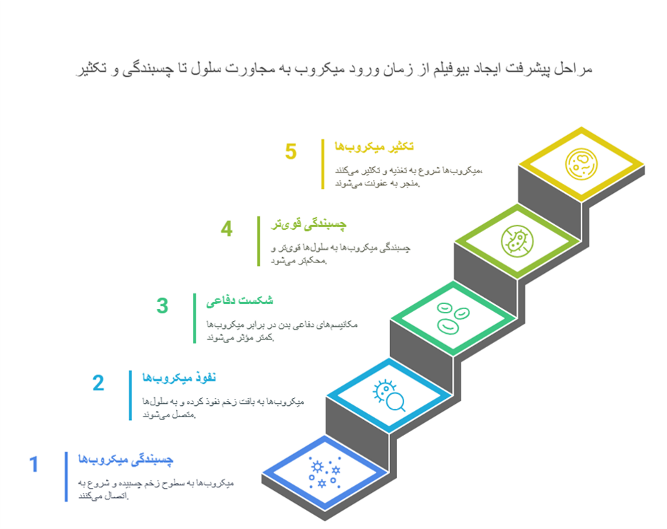 در ادامه روند چسبندگی قوی‌تر شده و اگر به حد خاصی برسد ، میکروب شروع به تغذیه و تکثیر میکند .