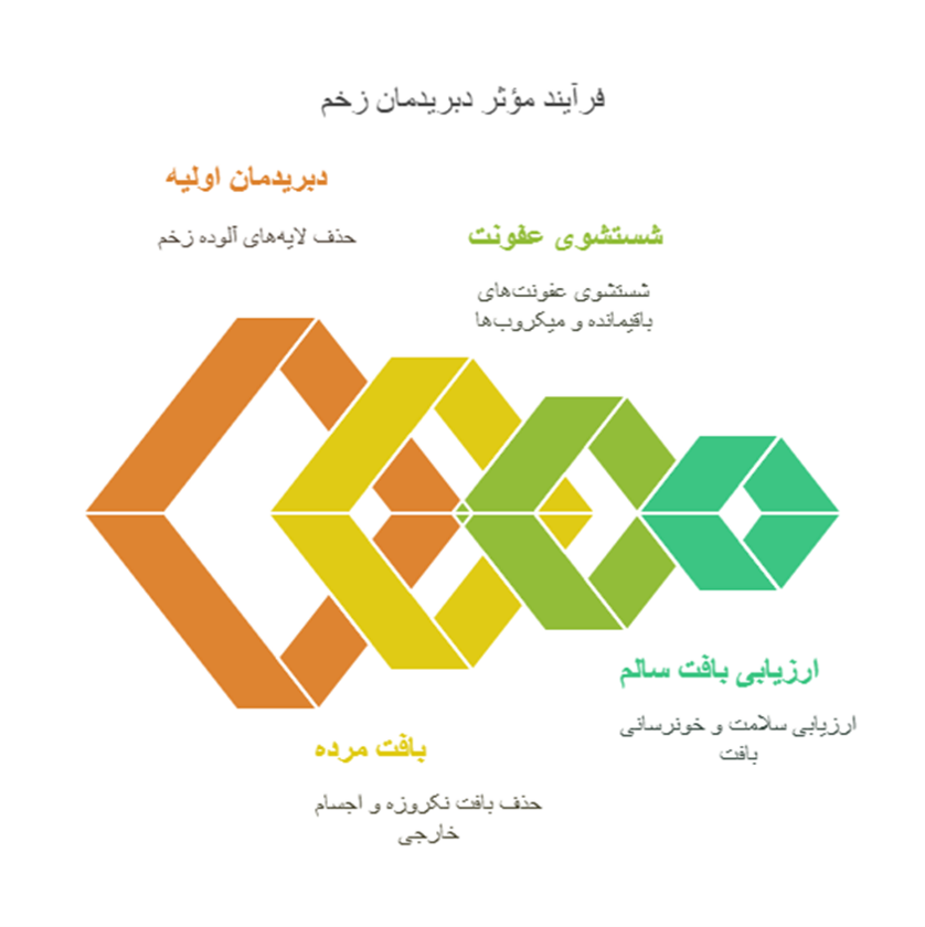 پس در نهایت دبریدمان عبارتست از حذف لایه سطحی و آلوده به بیوفیلم بافت در تمام سطح زخم و خارج کردن تمام بافتهای عفونی ، تمام بافت‌های نکروزه و تمام اجسام و وسایل خارجی از داخل زخم .