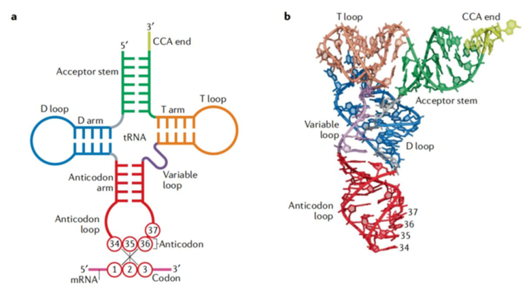 در سمت راست ساختار فضایی tRNA و در سمت چپ شکل شماتیک یک tRNA را مشاهده میکنید ، مولکول از یک تک رشته RNA ایجاد شده است . یکی از جالبترین خواص RNA این است که اگر قسمتهایی با بازهای مکمل در مقابل هم قرار گیرند یک دورشتهای درست میکنند ، مثلا اگر در قسمتی از رشته CGAUCA داشته باشیم و مثلا بیست باز جلوتر UGAUCG داشته باشیم وقتی رشته روی هم تا میخورد توالی دوم که برعکس میشود و تبدیل به GCUAGU میشود که مکمل توالی CGAUCA میشود و با هم یک بخش دو رشتهای درست میکنند ، همانطور که در هریک از چهار بازوی tRNA میبیند .