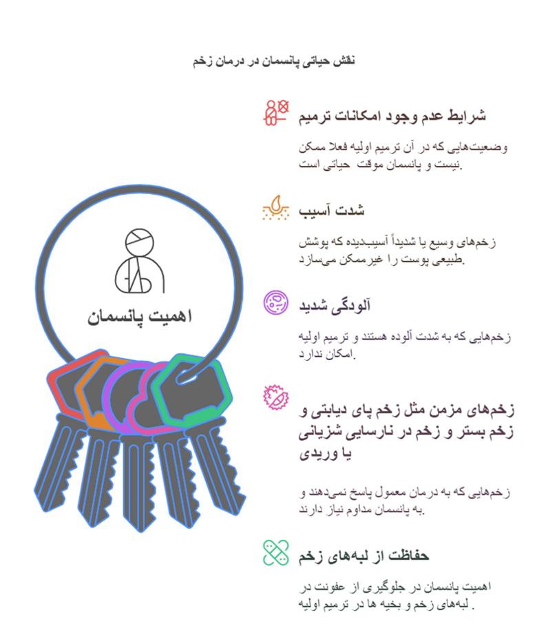 اگر شرایط ترمیم اولیه وجود نداشته باشد مثل در شرایط زیر پانسمان تعیین کننده سرنوشت زخم است .