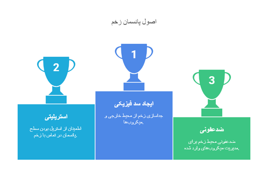• ایجاد سد فیزیکی : اولین اصل و فلسفه انجام پانسمان جدا کردن محیط خارج و میکروب‌های آن از زخم می‌باشد.